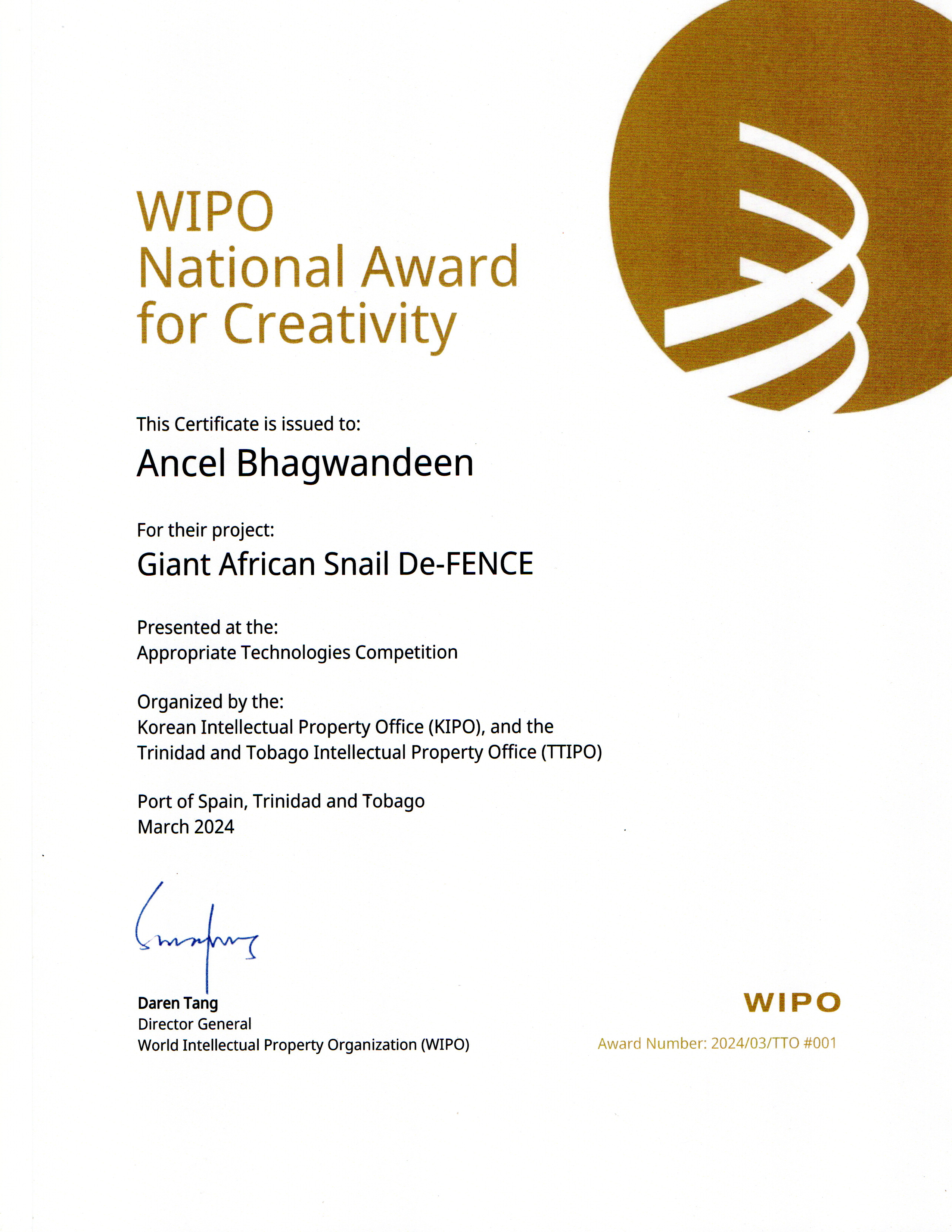 • The World Intellectual Prop. Office and IPOTT selected the SolarPonix (Snail DeFENCE) as a finalist in Appropriate technology in 2024